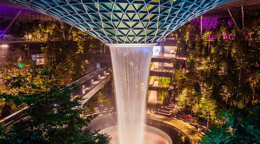 Sân bay Changi ở Singapore được biết đến không chỉ với dịch vụ khách hàng tuyệt vời mà còn nhờ vào những công trình ấn tượng như “Rain Vortex” – đài phun nước trong nhà lớn nhất thế giới. Điểm đặc biệt là màn hình LED xung quanh đài phun nước này, giúp tạo ra những hiệu ứng ánh sáng và hình ảnh tương tác, tạo ra một trải nghiệm thị giác độc đáo cho hành khách và du khách.